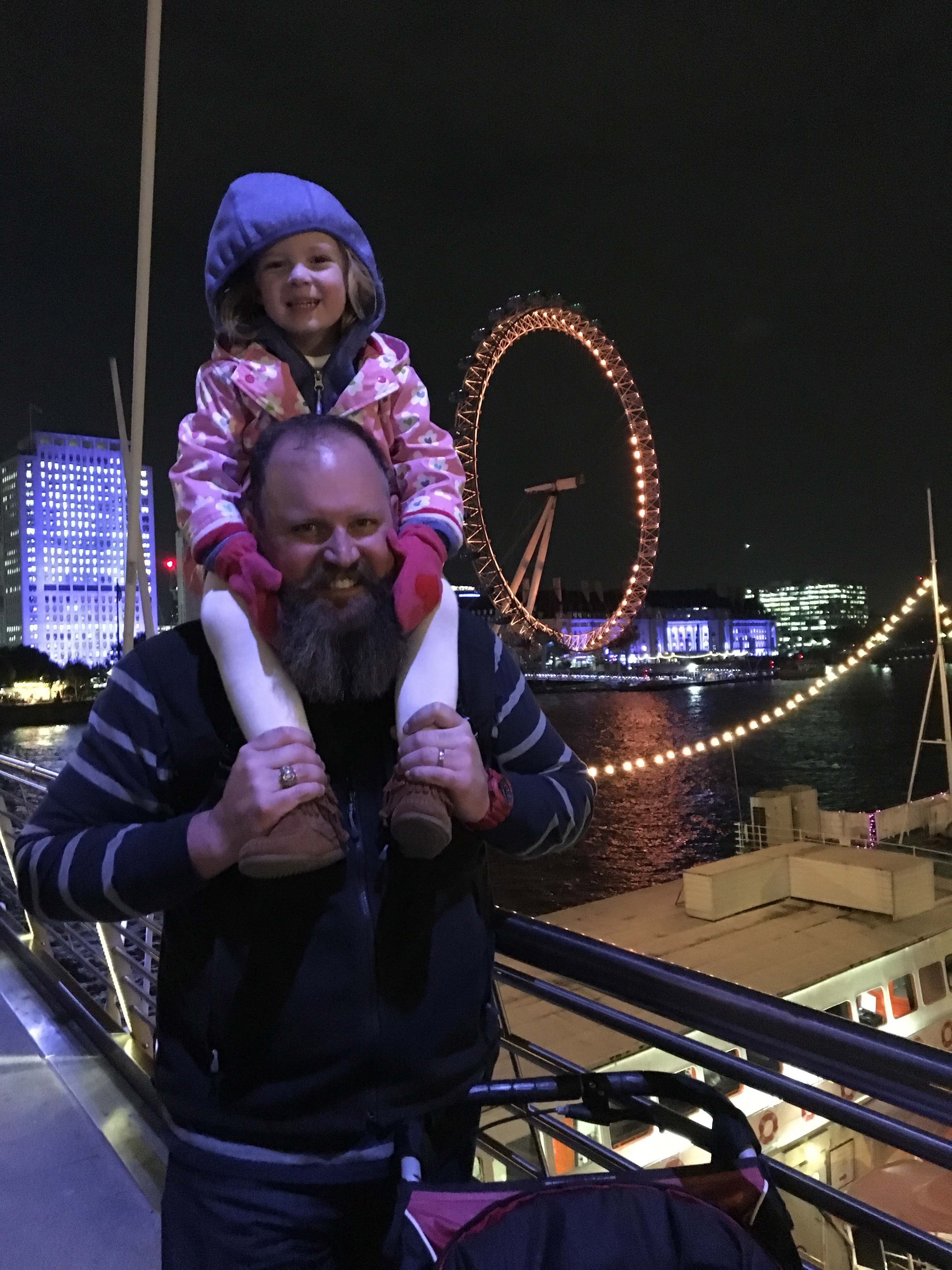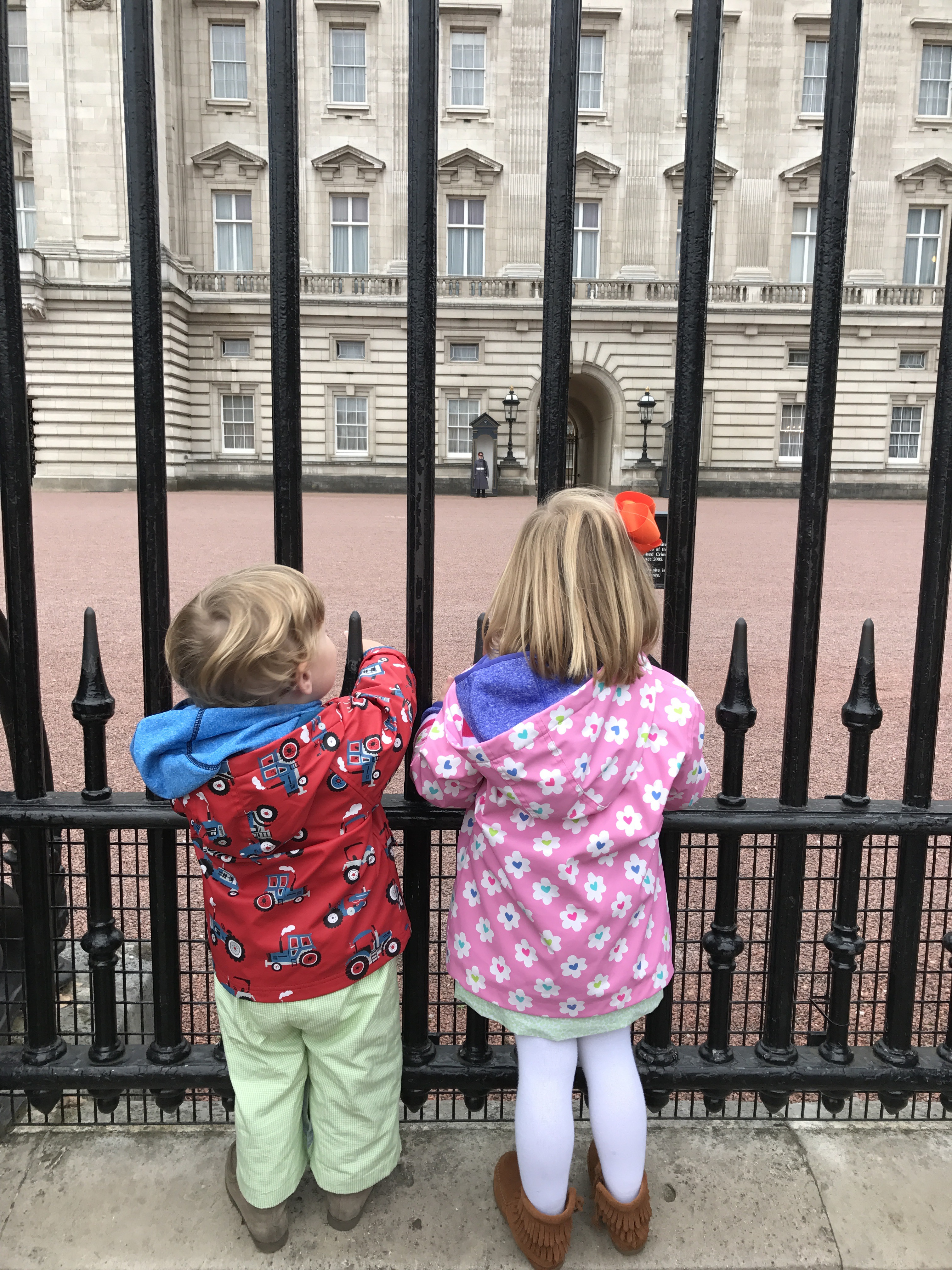 We made it to London but now Cory goes to work…boo! I shouldn’t boo hoo hard though as this is the reason we’re all here. We are staying at the London County Hall (where Cory and his family stayed 18 years ago) and we don’t have to go far to see a lot! We can view Big Ben while we eat breakfast each morning…bonus! The kids and I had a relaxing morning then hit the pavement for sights after early naps. We saw Westminster Abbey then walked through St James Park toward Buckingham Palace. Bea and Teddy had a blast seeing the birds and ducks in the pond; Teddy kept calling the bigger ones the “momma duck”. Even though we’ve come at ‘off peak’ season, it’s still quite bustling everywhere. You do see more construction (we did in Paris too) to prepare for the summer months. Bea loved watching the guards marching back and forth in front of Buckingham Palace; Teddy had been in search of a lion all day which we luckily found statues around the fountain in front of the palace. We walked on down the mall toward Trafalgar Square where we found four more huge lion statues. This pleased Teddy! Cory joined us here for a delicious Italian meal before we walked to the London Eye for a night ride. London at night is even more beautiful with all the city lights!