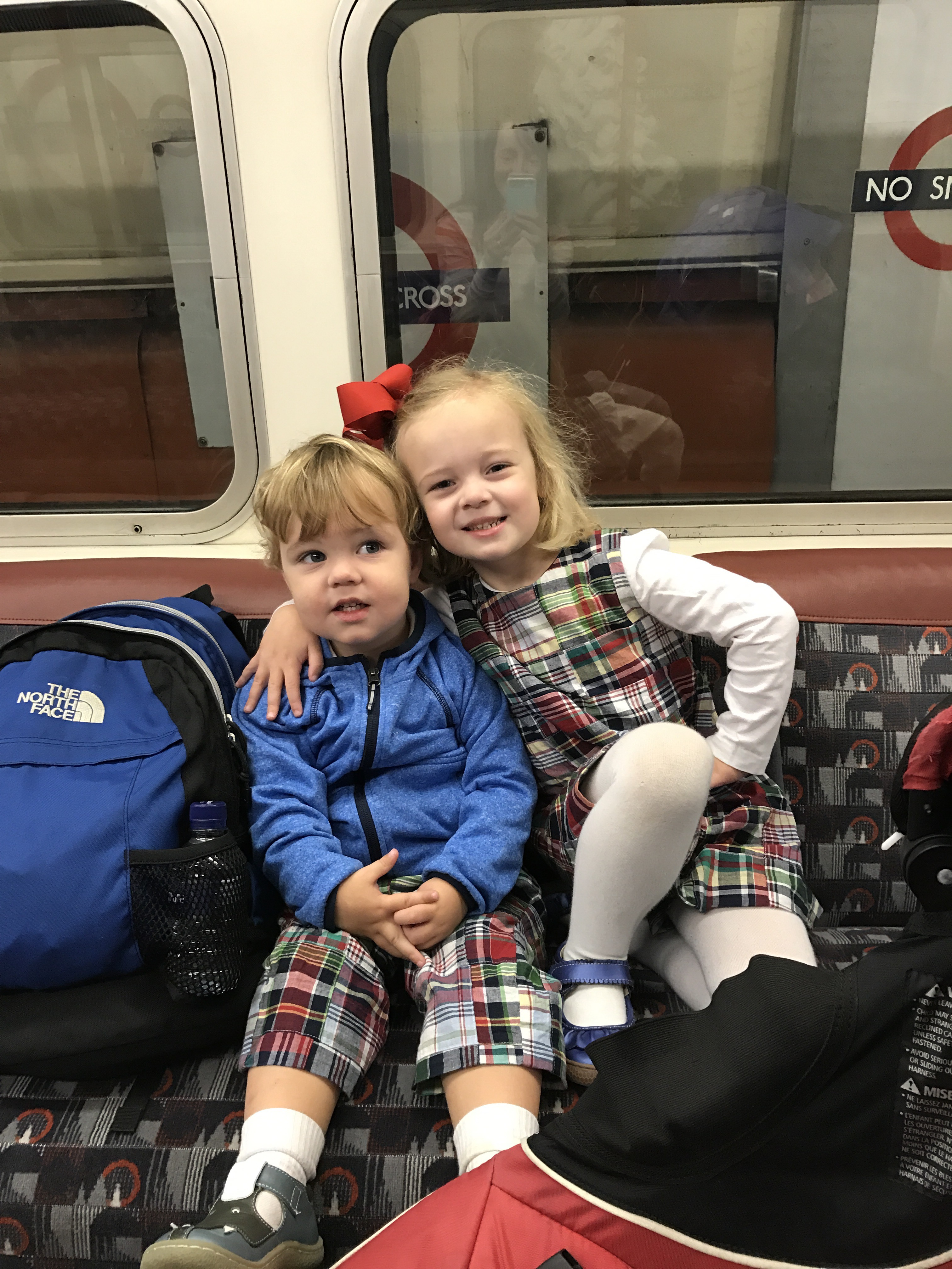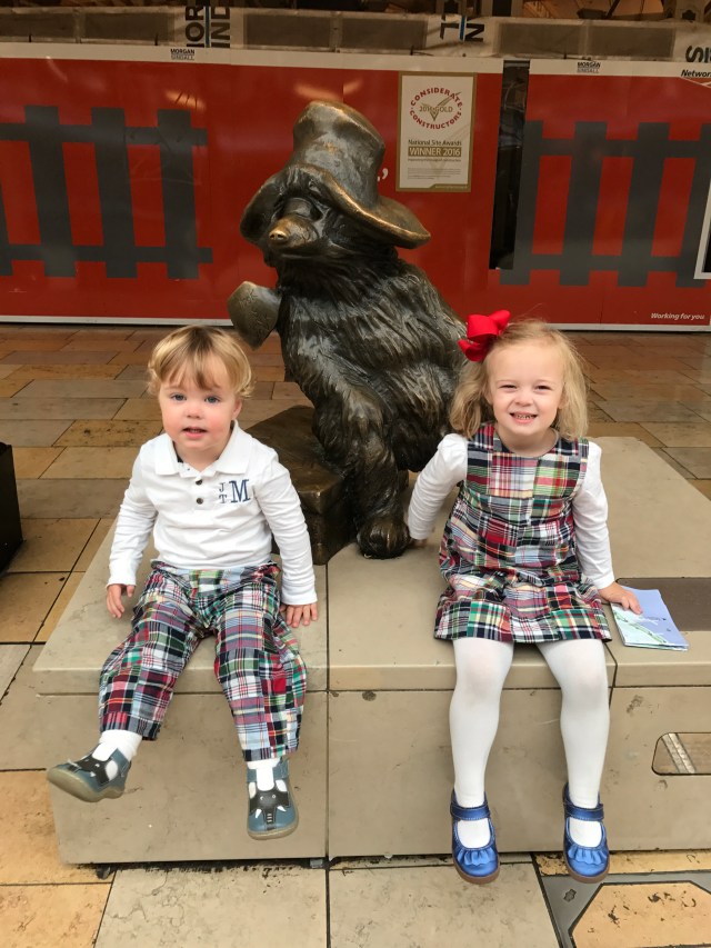 Tuesday was all about Bea and Teddy! We walked to the Waterloo Train Station for a tube ride. It’s challenging to navigate the tube with a stroller but everyone here is so helpful! We found some lifts but luckily we also found two sweet ladies that held Bea and Teddy’s hands as I carried the stroller down some steps. It doesn’t seem to be completely handicap accessible! That wasn’t the only help we had going up and down stairs and I was grateful! We rode to Paddington Railway Station and you can probably guess who we were going to see… Paddington Bear! We found him by a kiosk station (bigger store is under renovation) and Teddy proceeded to hug and tell him that he loved him. 🙂 Then Bea used her map to find the bronze statue under the clock on platform 1…where he met his family the Browns. This was all a huge hit! Diana, Princess of Wales Memorial Playground was our next stop. The people here still love her dearly and keep her memory alive all throughout the city. This playground was expansive with so many nooks and crannies. They enjoyed different types of equipment to play on from what we have at home. Luckily I talked them out of the sand areas…why do they love sand at a park?! We continued on walking through Kensington Gardens and it was beautiful with green grass and colourful changing leaves. We took a taxi home and they’re so convenient for us; it’s big enough that I don’t even have to fold up the stroller for us all to fit! Cory walked with us to supper (after nap time, of course) at a restaurant in an old fire station. Then we were thankful for Teddy being a bit older (than our Australian trip) as I showered the kids (no tub) then pulled a traveler’s go to by washing some clothes in the sink.