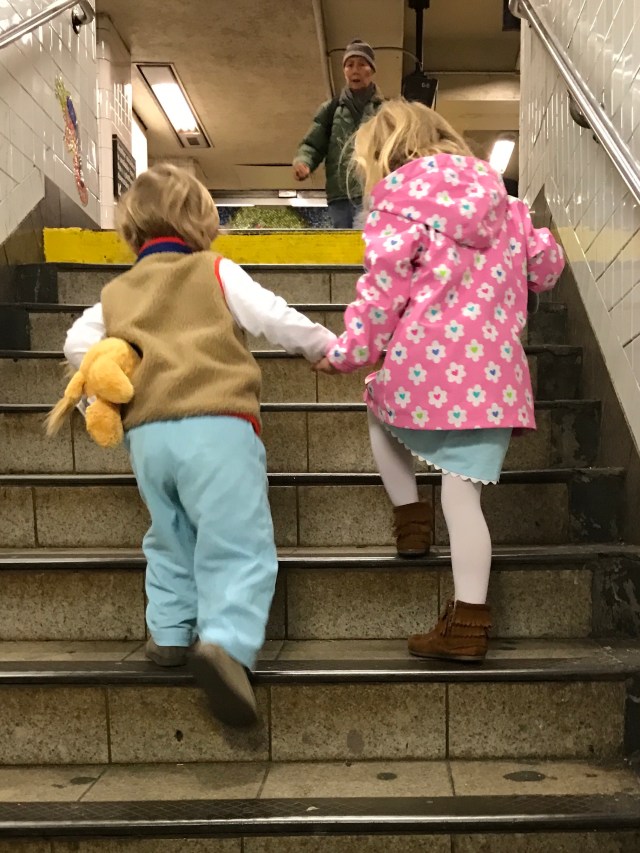 When Cory works late, he tries to have breakfast with us which he did the next day. Bonus to this was he helped us buy our tickets and get on our first Subway ride. It’s always great to have an extra hand when you try something new for the first time while also wrangling two kids. We rode the same first leg as him then we went opposite directions. All was going smoothly until the train didn’t stop where we planned to get off! We got off a couple stops later (once it finally stopped) and back tracked on the train. Of course our stop didn’t have an elevator so sweet Bea held Teddy’s hand walking up the stairs while I carried the stroller behind them….in the rain. The result was the Children’s Museum of Manhattan; a super fun museum with highlights of Zanzibar, Japan, Dora the Explorer and a play area. They did so well sticking together as I requested! Next was lunch at a true NY deli called Artie’s Delicatessen. I had the tallest salami sandwich I’ve ever seen and Bea enjoyed the pickles. Back in the rain we go to get on the Subway. Unfortunately, we went down (steps only) the wrong direction to the train. Agh! So back up we went and a nice lady held Bea’s hand on the steps back up. So we went across the street to the correct stairs and finally got on our train. We got off too early so we hailed a taxi for the rest of our journey to a friend’s house. We spent the afternoon/evening with her, her daughter and son. She is a good friend of my sister’s and was a true delight to be around! The kids had a wonderful time playing and relaxing in their home for the evening instead of being stuck at a dinner table or in our hotel room. She even cooked us all supper too! We took the bus home but not without Teddy getting his foot stuck between the seat and a pole. Oh mercy!