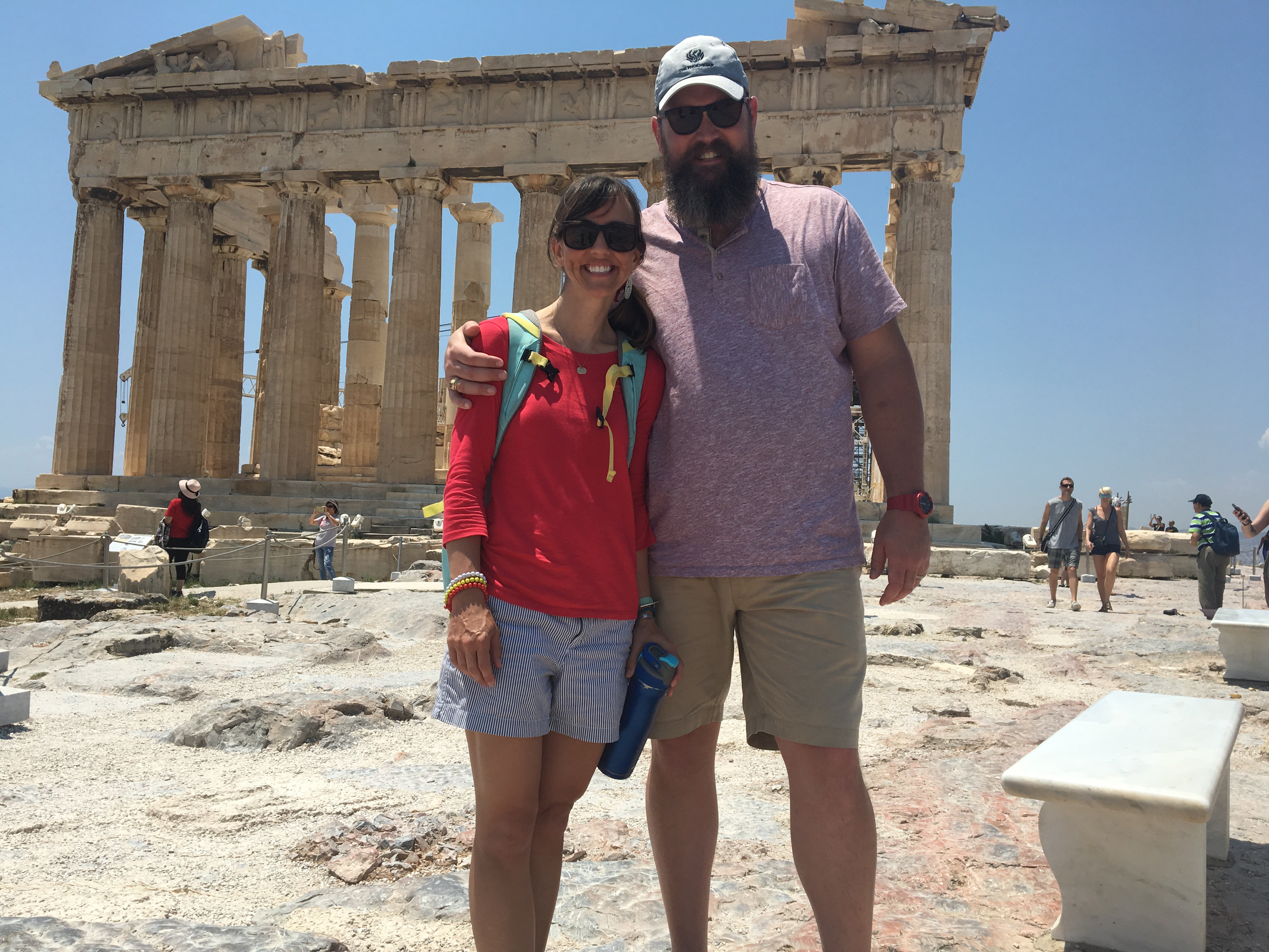 We did sleep in a bit on Saturday, June 10th, for our bodies to recoup, but we started our morning right with a delicious breakfast made by the Greek family who ran the hotel. The owner, Mr. George (or Boss as they called him) was so kind to our kids! He especially took to Teddy. It was precious to watch them play together even though they shared no common language….paternal sweetness and play transcends speech! To get our bearings and gather a good summary view of the city of Athens, we opted for the hop off hop off bus. Yes, it is a total tourist move, but we’ve found this is always the best way to see the most in a short amount of time. City Sightseeing buses are all over the world and offer discounts if you bring previous tickets with you. Our first stop was to the Acropolis and Parthenon. You couldn’t bring strollers up but they had an easy and free stroller check available. As we walked up the slippery, beautiful marble to the top, I got teary eyed at the view. Wow! Standing where others had been so many hundreds of years before and worked so hard to build these unbelievable buildings with little resources was almost unfathomable! Talk about hard workers! Also knowing these sites had been here since the 5th century was hard to comprehend! We then headed to the Plaka area for lunch and window shopping then back on the bus we go. We selected a restaurant close to the hotel for supper called Alexander the Great which was so delicious and kid friendly!