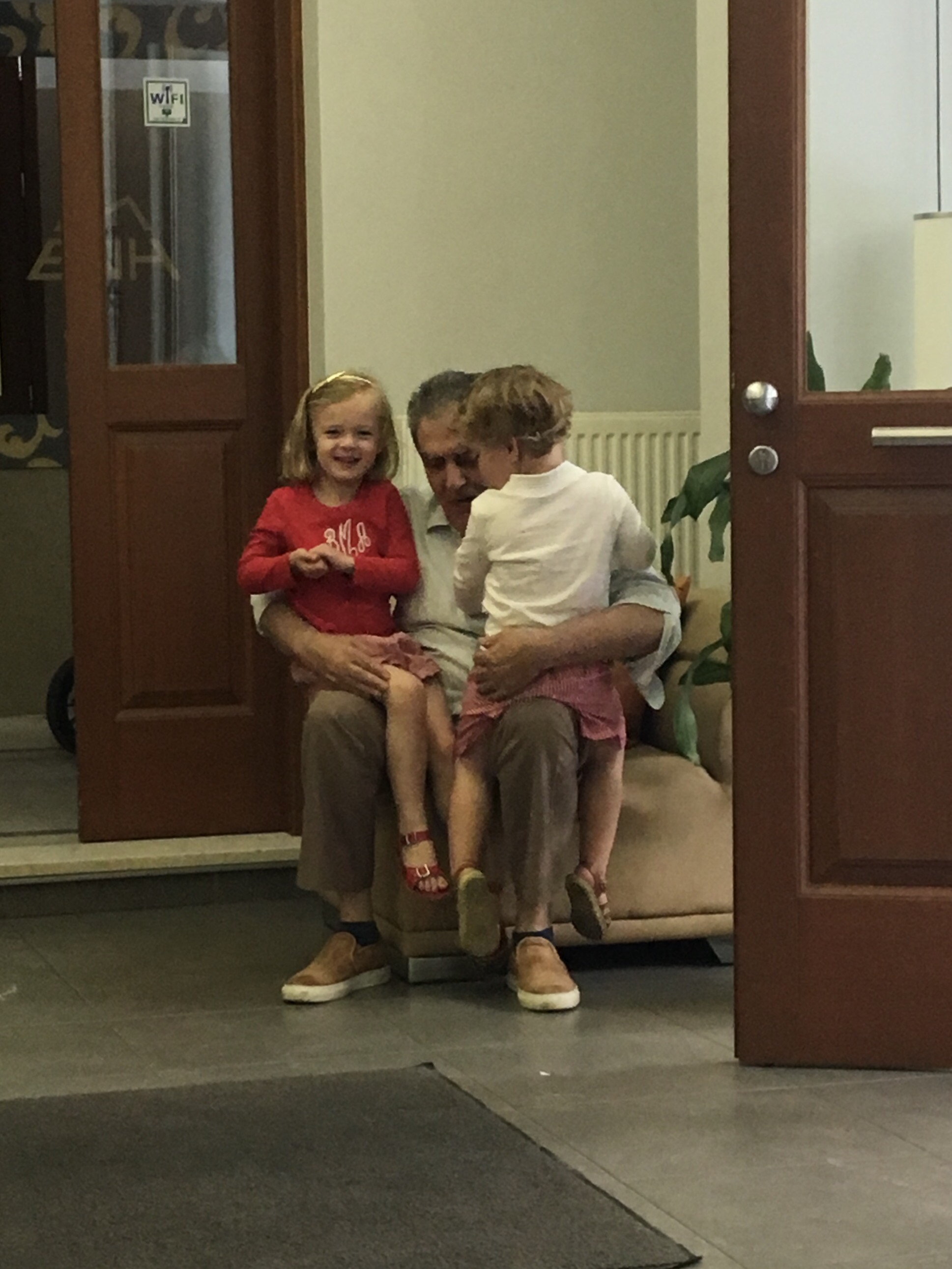 This weekend is the official start of our “vacation” whilst we are on this little European adventure…Daddy and the whole crew could not be more excited. Our preferred transport method from airport to hotel is generally a van or shuttle; but in Athens at 11pm with no prearranged ride, we are out of luck. So we punt and two taxis it is…thanks mostly to the jogging stroller that pushes us just past fitting all our stuff and crew in a large sedan. It was a 45 minute drive ($$$) to our hotel, which meant a super late night. So goes a travel day!