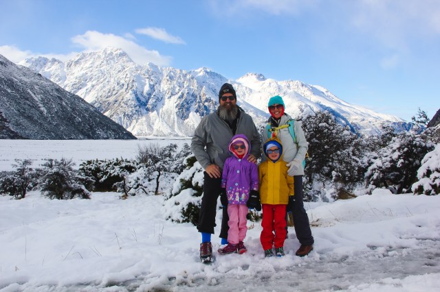 Wanaka Kiwi Holiday Park worked great for our evening’s accommodations too. The next morning, Cory snuck off and booked us on a glacier helicopter ride! Boy, were we all excited! Wanaka Helicopters, a boutique, family business, provided an amazing experience with Pilot Pete (son of the owner) piloting our flight. The kids and I had never been in a helicopter and they sat in the front seats giggling as we took off. I, on the other hand, was teary eyed as we took off. Did I forget to mention, it was just the five of us…our family of four and the pilot. It was such an amazing feeling and could not believe I was getting to do this! We flew over Lake Wanaka to Mount Aspiring (featured in Lord of the Rings) seeing beautiful snow-capped mountains. New Zealand has some of the most breathtaking views including amazing waterfalls that we flew right beside and blue ice, which is highly compressed snow that free of any air inside. We did not realize the best was yet to come; that would be when we landed the helicopter on a glacier! Yes, that’s what I said and in one meter of snow. The kids played and played in the snow; they were covered in snow when it was time to get back in the helicopter. What a magical, unbelievable experience we had! I sat up front on the way back and soaked in the landscaping beauty. I’m still pinching myself!