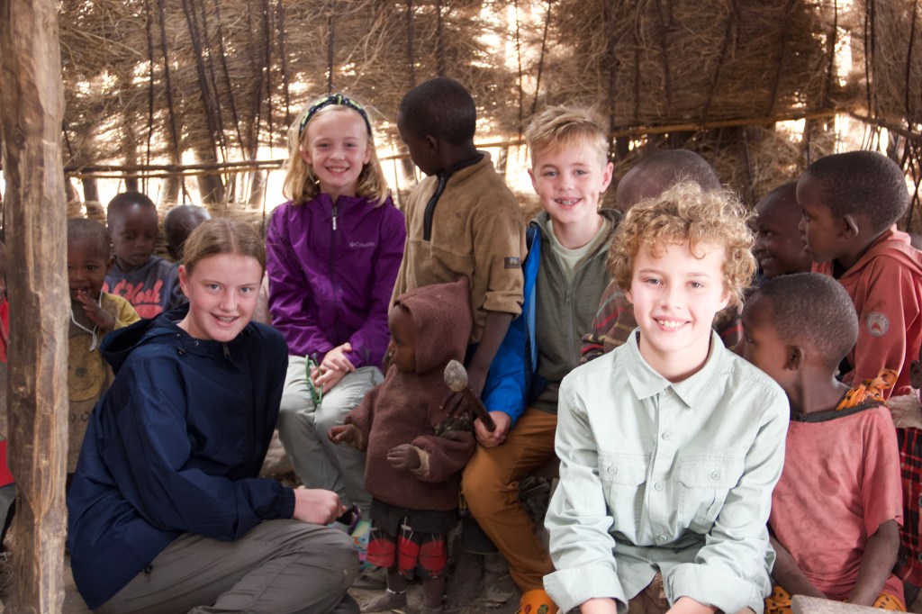 Next stop is the Serengeti National Park! We packed up from our lodge headed to visit a nomadic Maasai boma which means they are very primitive and move every five years or so to find better grazing grounds for their cattle. They performed a celebration dance and songs for us as well as we met the chief. We were told by our guides who are both Maasai members that it is quite a big deal to meet the chief as there isn’t just one per boma. The chief resides over many groups. The school kids, who showed us what they knew, were all very small children as the older ones are away at boarding school. The Tanzanian children loved seeing our kids and niece and nephew; they kept saying ‘sit by me’ in their mother tongue which is different from Swahili. At school in their village, they speak their mother tongue and/or Swahili but when they go off to school, they speak English and Swahili. It’s a great system if you’re able to go to secondary school as some of your classes are taught in English only. At the boma, we visited their TINY house where four to six people somehow fit; Cory could barely get through the door with his broad shoulders. Then we went shopping at the tables around their huts full of items they had made for us to purchase…jewelry and potting pieces mostly. We found a few items to take home with us. Like I mentioned, this type of boma is quite primitive but they do have huge tanks of fresh water. My mom (who came to Tanzania 17 years ago) said they didn’t have those back then.