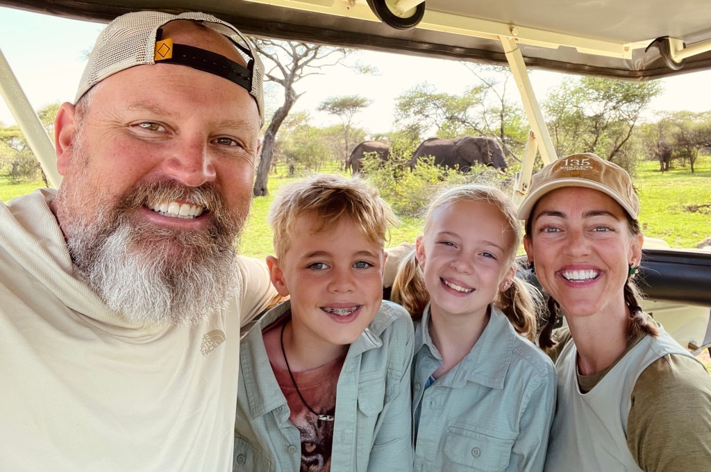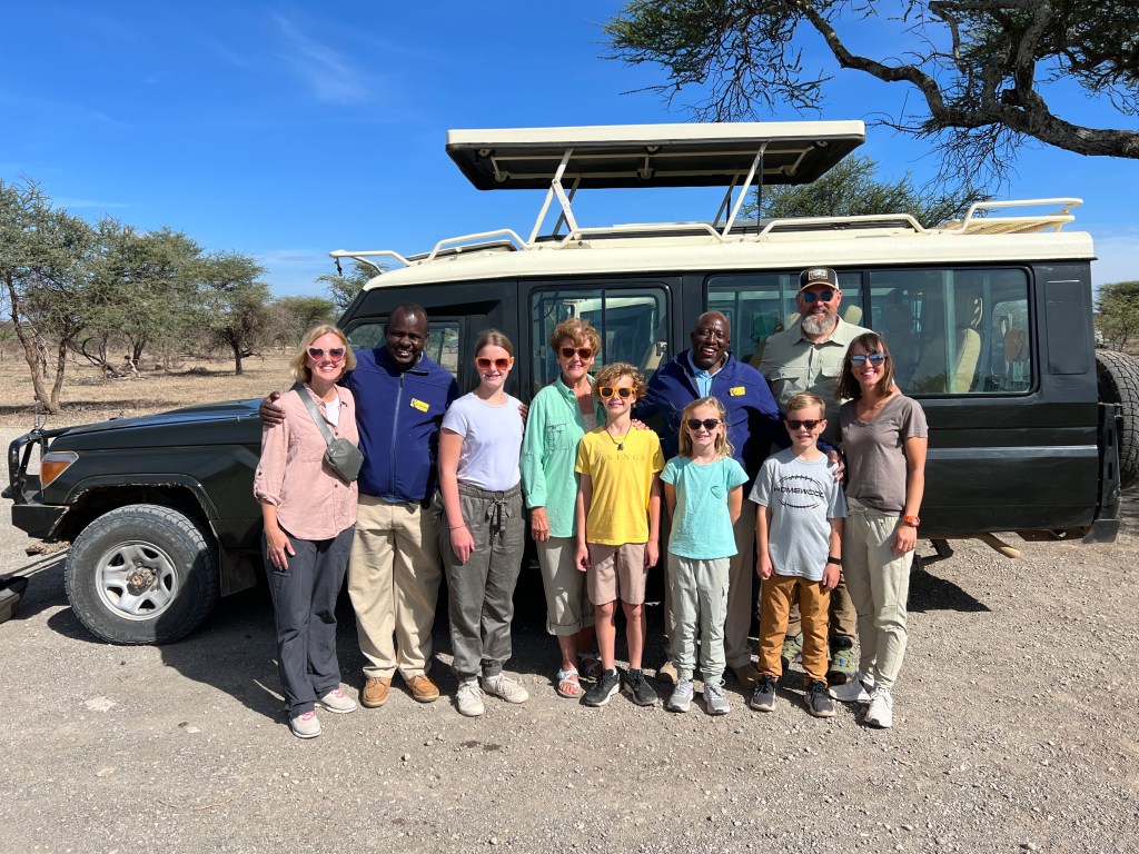By the end of our trip, we had spent so much time with our guides that it was sad to say bye! They have taught us so much about their land and animals but also their language. Bea has a whole notebook of Swahili words, and she used them appropriately all week long. I think it tickled our guides that she was so excited about their language! One last group picture of whole crew by the trucks and thanking Lucas and Anderson for the best trip ever! They were so complimentary of our family and seemed like they had just as much fun as we did! Our final drive to the Ndutu airstrip and thought we’d see some animals on the way. We guessed what we’d see and, in this order…guinea fowl, dik-dik, impala and giraffe and it happened just in that order! What are the chances! Our guides joked that the animals came to tell us bye.