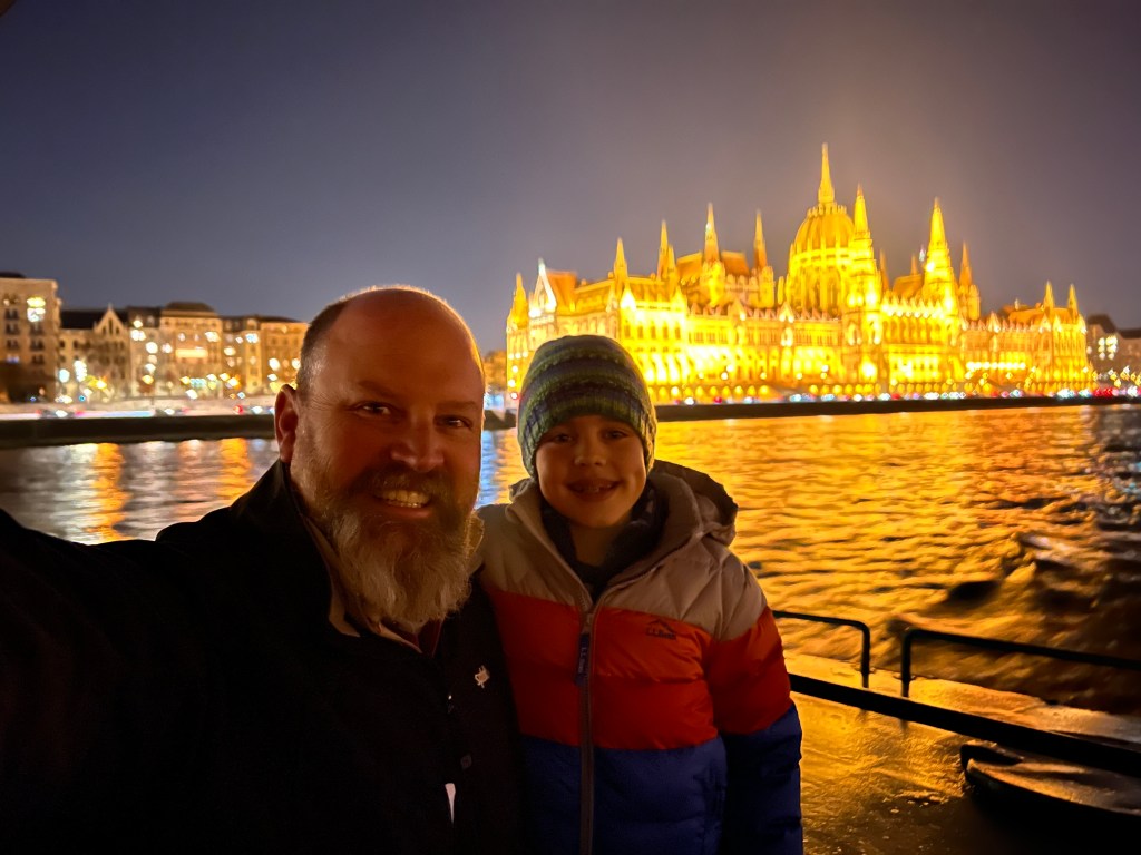 We waked up to snow and more coming down; we had been hoping for this! Again, we’re in a great location to easily walk to the train station for our train to Budapest. Prague’s train station is super nice with a really fun, very detailed Lego train station inside. It’s still snowing as we head out on our longest (seven hours) train ride of the trip. We arrived to find a cab who gave us a good deal to get to our VRBO that’s tucked away in a courtyard style apartment building. The apartments are on the outer rim with courtyard in the middle. We found an amazing place for dinner at Vendiak…best meal in Budapest. I had a lovely Julius Meinhl fruit tea and potato soup, Cory had roasted pork bravas style and kids weinerschnitzel. It was all delicious!
