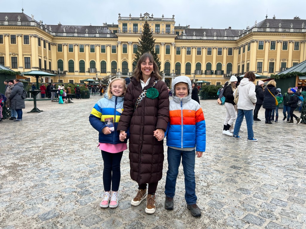 Today in Vienna was a day for walking. We walked to and toured St. Stephen cathedral which was beautiful and a building that began construction almost 1000 years ago. Wild to think of that long ago! The cathedral is located in a plaza that’s full of energy and I can tell it’s going to be even better seeing the Christmas lights when it gets dark. Another day, another Christkindhlmarkt we happened upon while walking around. The kids got treats but then we found Cory’s ultimate Vienna treat…kasekrainer at a street vendor. It was even better than he described! On we walked to City Hall to find another Christkindhlmarkt and the neatest ice skating trail. It wasn’t just a circular rink but had a pathway to skate through. The kids and Cory had a blast doing this. Bea is quite good as she roller blades at home! Teddy fell a handful of times but always got back up and kept going…learning resilience!